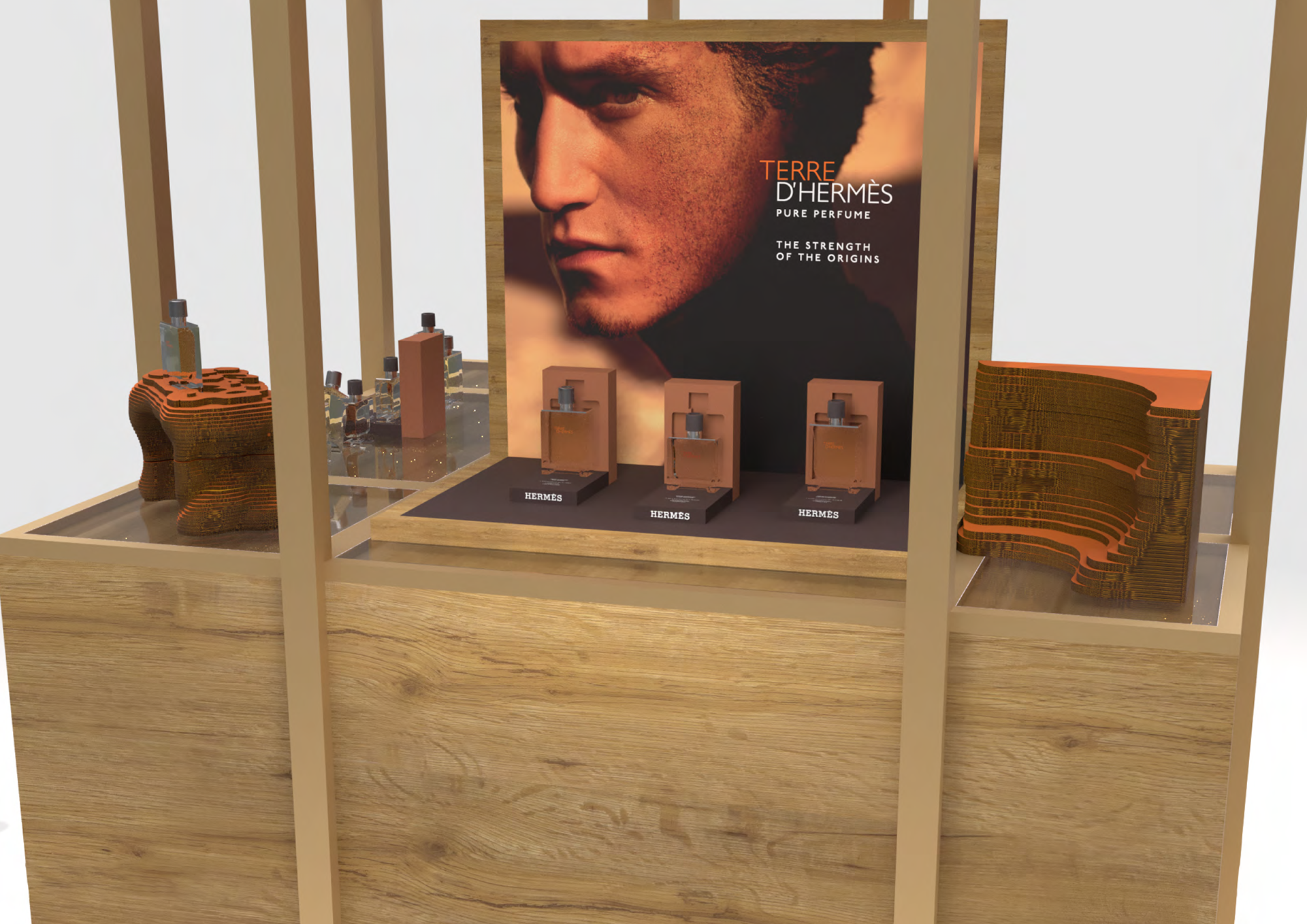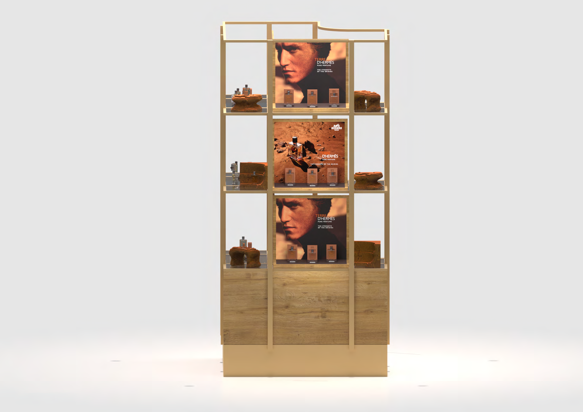 Developed the Gold, Silver and Bronze tier displays for the Terre d’Hermès campaign at Harrods, inspired by the fragrance’s natural and earthy aesthetic. The stand featured 3D printed terrain mounds that echoed the desert landscapes from the campaign imagery while serving as sculptural product platforms.
